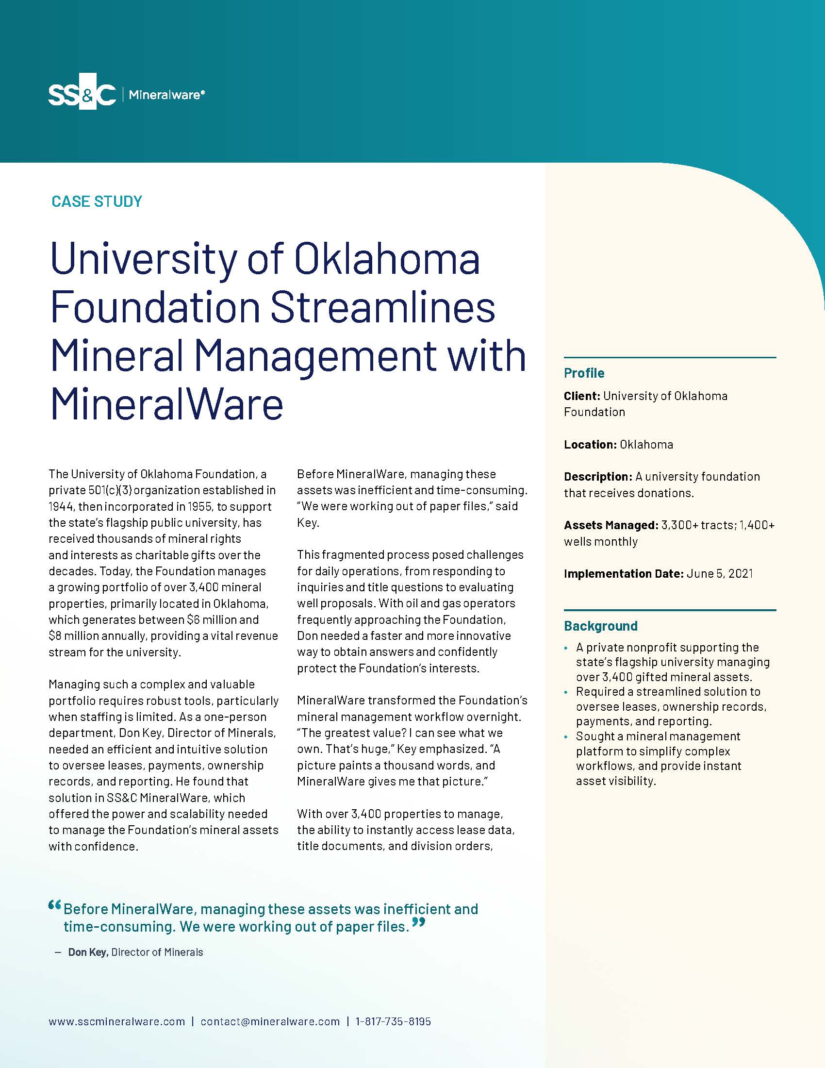 The University of Oklahoma Foundation is a private nonprofit that supports the state’s flagship university. Managing thousands of mineral assets gifted to the university was a challenge for their limited staff. With more than 3,400 properties generating $6–$8 million annually, the Foundation needed a better way to oversee leases, payments, ownership records, and reports.